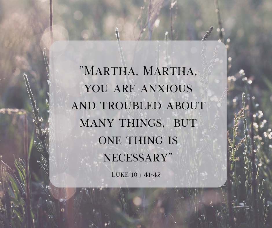 “Now as they went on their way, Jesus entered a village. And a woman named Martha welcomed him into her house. And she had a sister called Mary, who sat at the Lord’s feet and listened to his teaching. But Martha was distracted with much serving. And she went up to him and said, “Lord, do you not care that my sister has left me to serve alone? Tell her then to help me”. But the Lord answered her, “ Martha, Martha you are anxious and troubled about many things, but one thing is necessary. Mary has chosen the good portion, which will not be taken away from her”.